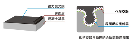 施工时,一方面卷材反应胶粘料与水泥浆(或现浇混凝土)接触后发生水解反应,生成醚键,使水化硅酸钙浆与卷材胶料层形成化学交联结构产生粘结;另一方面,胶层和水泥浆充分湿润后,双方表面张力接近,使二者紧密结合,产生物理吸附作用。故而使卷材与水泥浆(或现浇混凝土)起到“化学交联-物理榫卯”的协调反应粘结,达到牢固的"肌肤式"防水效果。